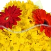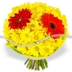 ДЕЛЮКС: хризантема кустовая желтая - 21 шт., гербера красная - 2 шт., фетр зеленый. Примерный диаметр букета 50х50 см.