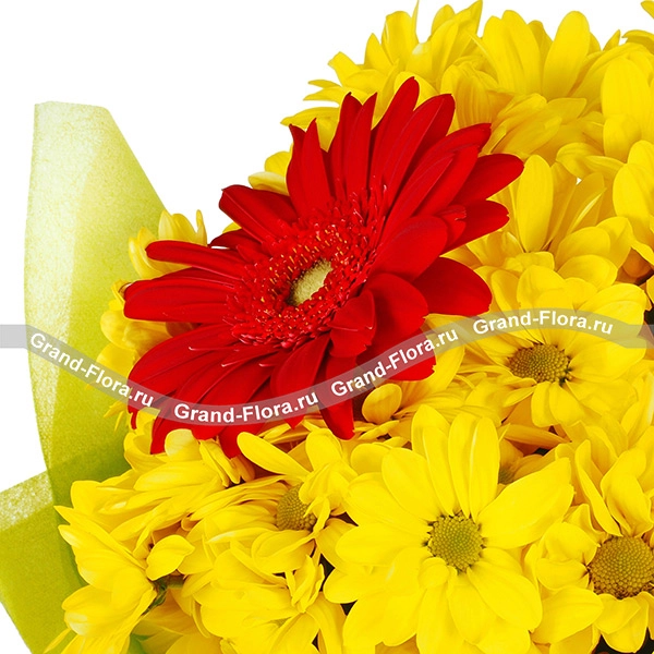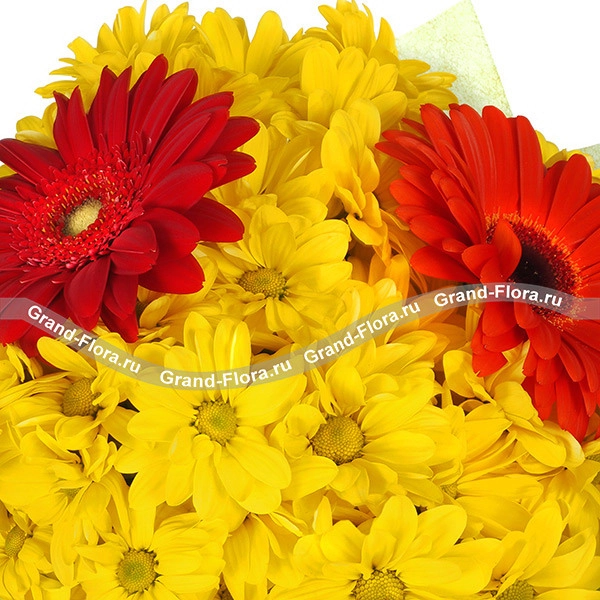 Яркий букет, в центр которого помещена пара огненных гербер, завершает солнечная кустовая хризантема. Такое сочетание цветов вмиг поднимет настроение его получателю. Игривая композиция поможет выразить глубокое чувство привязанности и любви, а также станет великолепным вариантом в качестве подарка значимой женщине в день ее рождения. Ваша мама наверняка запомнит столь очаровательную композицию, а девушка моментально забудет все обиды.